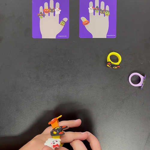 New for Halloween! These cute rings along with picture cards make for great fun while encouraging use of both hands, bringing awareness to those little fingers and following picture patterns. 10 quality silicone rings in a set. 10 double sided picture cards to copy.
